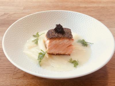 Kabeljauw met een korst van volkorenbrood, schorsenerenpuree, spinazie en grijze garnalensaus