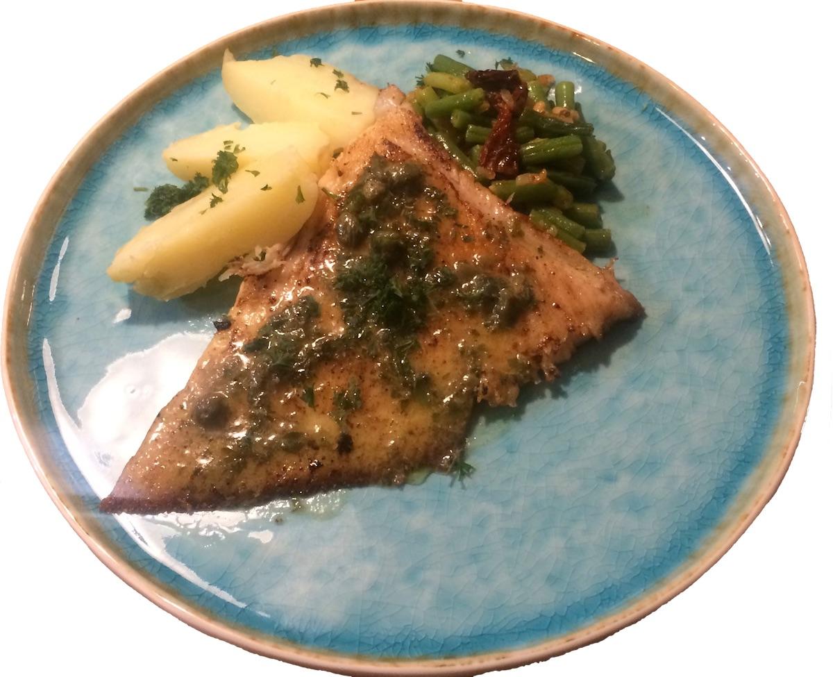 Leg de vis op een bord en oversaus met de kappertjes-botersaus.